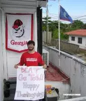 With the upcoming Georgia vs. Georgia Tech game, I decided to send you a photo to show you and the rest of the athletic department that in a country of only 250,000, there are at least two Bulldogs, representing the bulldog nation, and flying a bulldog flag right next to our Belize flag!
