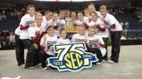 March 29, 2008 -In possibly the most bizarre ending to a Southeastern Conference Gymnastics Championship, the top-ranked Georgia Gym Dogs edged out Florida and Alabama in front of a record SEC Championship crowd of 9,022 at the Gwinnett Arena on Saturday to claim their 16th conference title.